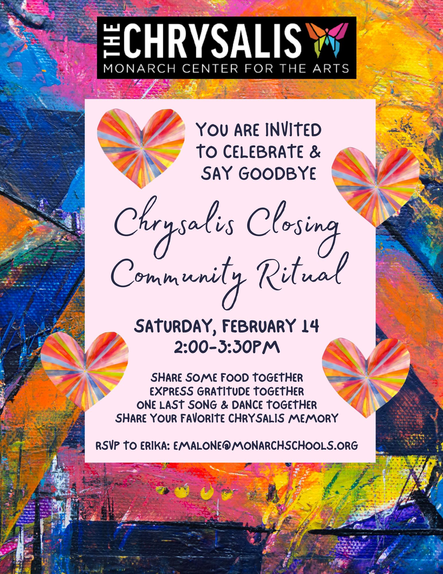 Join us for a meaningful closing ritual as we gather to honor the Chrysalis community and the impact it has had on all of us. This all-ages event will take place on Saturday, February 14, from 2:00–3:30 PM, and is open to anyone who has been part of the Chrysalis journey.